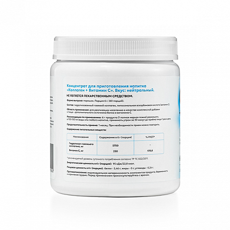 Концентрат для приготовления напитка «Коллаген + Витамин С» (60 порций) — комплексная пищевая добавка с нейтральным вкусом, созданная для поддержания здоровья суставов, кожи, костей и сосудов.
